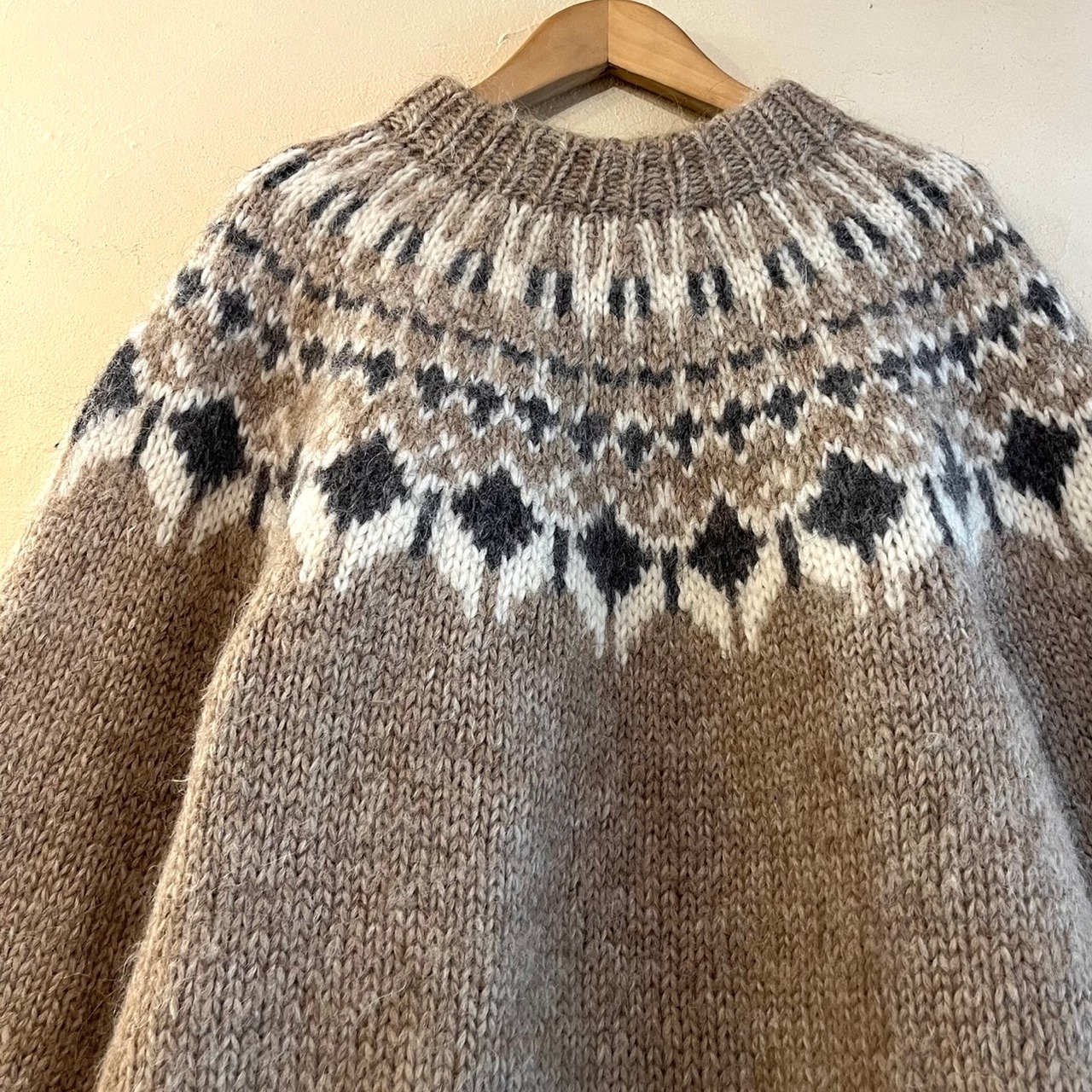 絶妙なお色のノルディック模様編みに、すっぽりとしたシルエットが可愛らしいです◯